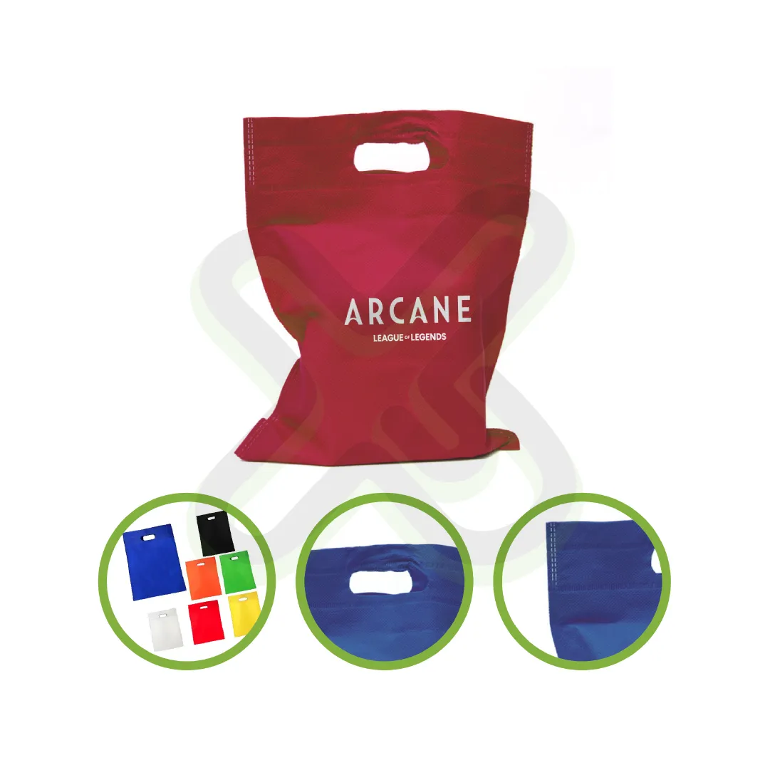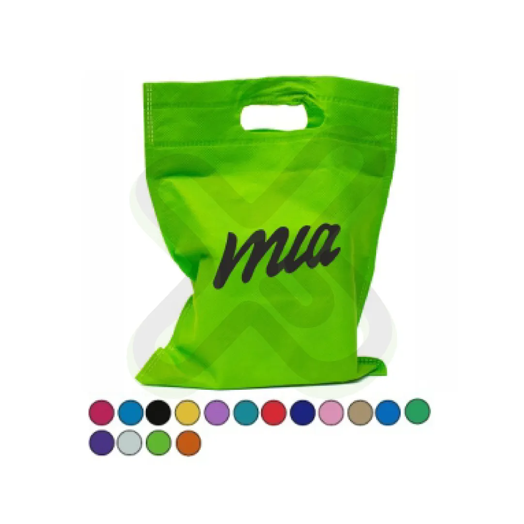 Material: Notex thermosellado; Medida40*30cm aprox; Asa: Troquelada; Impresion: Serigrafia 1 color; Acabado: embolsado 50unds