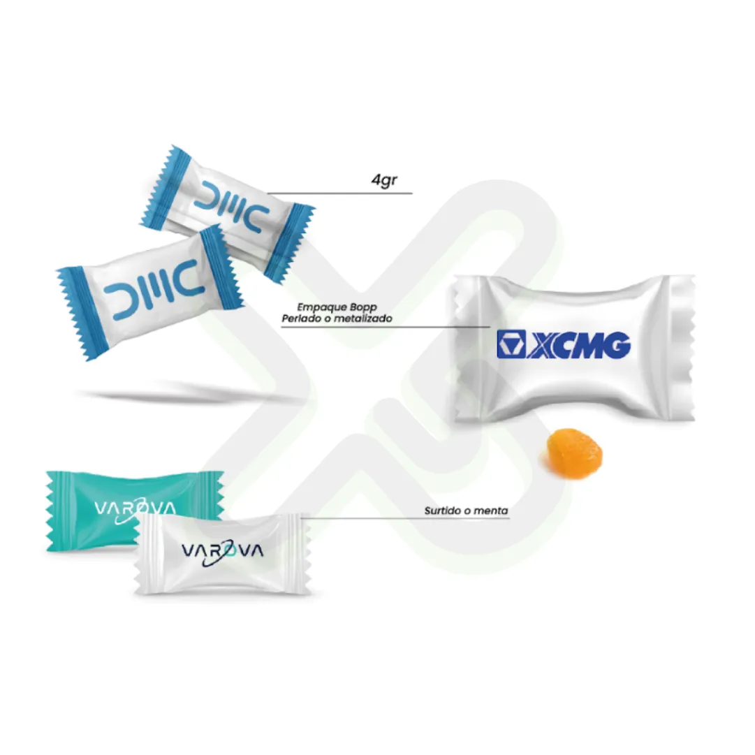 Caramelo promocional de 4 gramos con empaque BOPP perlado o metalizado. Sabores surtidos o menta. Impresión personalizada y presentación en bolsas de 100 unidades. Perfectos para eventos, ferias o puntos de venta.