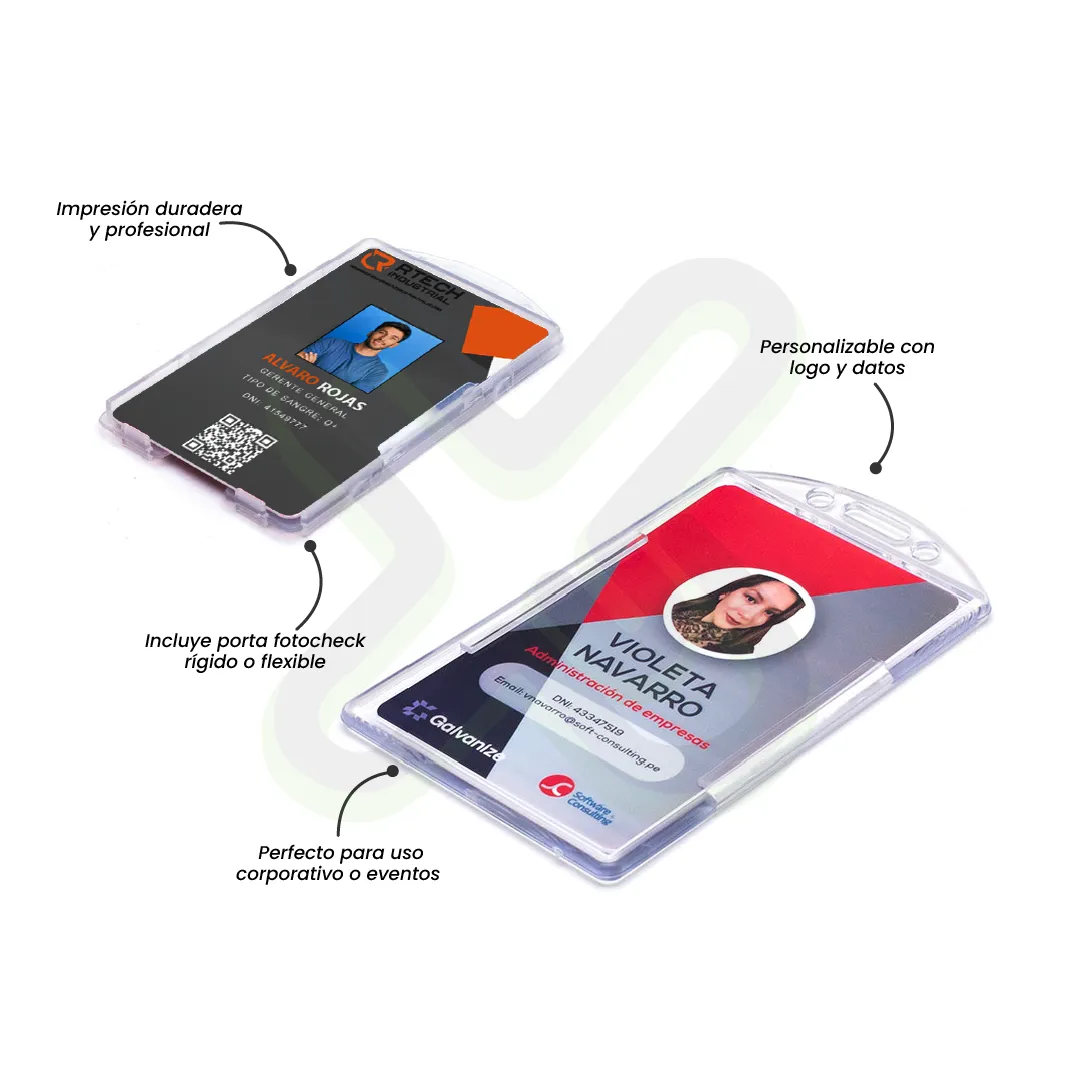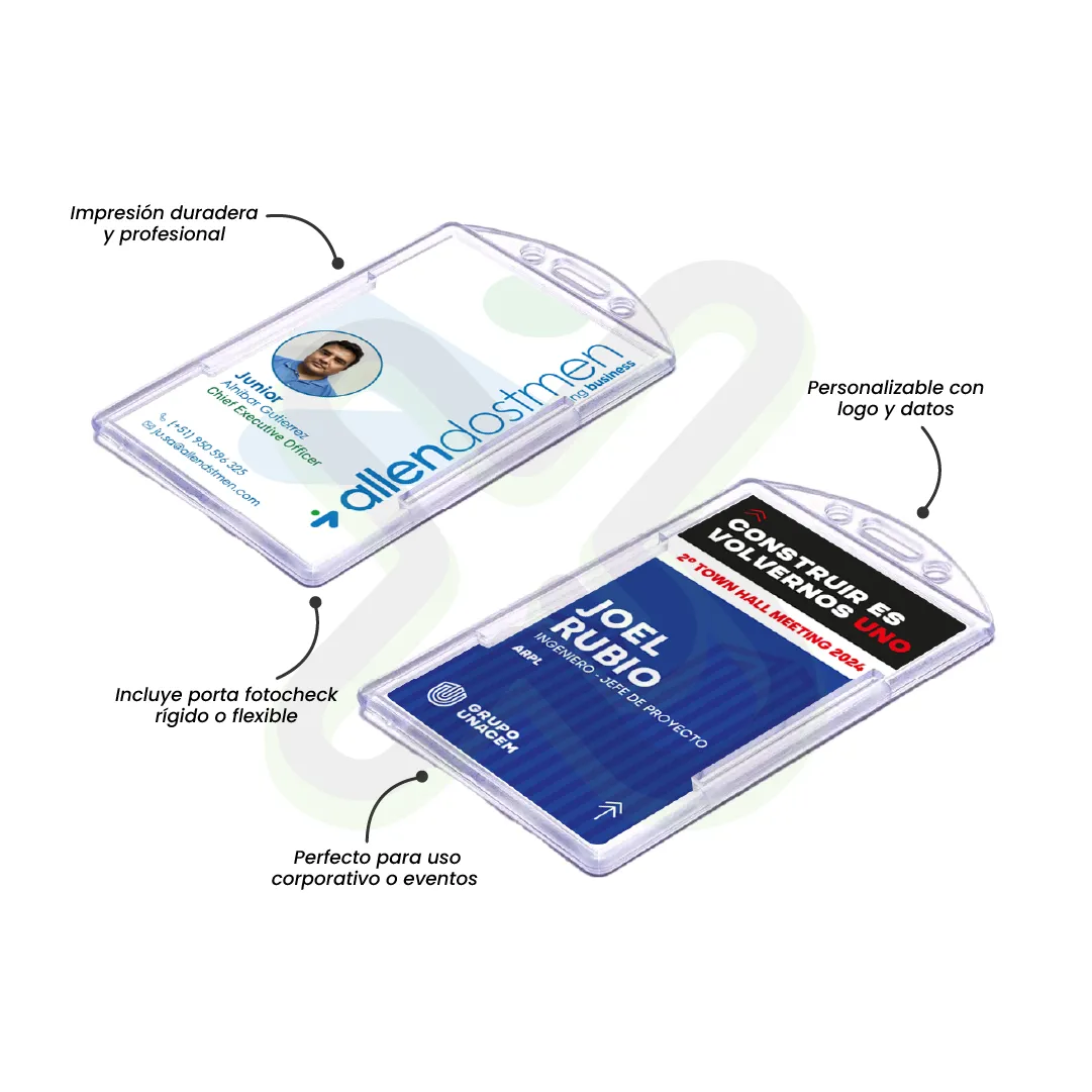 Mantén tu identificación segura y siempre visible. Este fotocheck de PVC incluye un resistente porta fotocheck, con impresión láser de alta calidad en la credencial y sticker personalizado en el yoyo, ideal para eventos, oficinas y actividades donde la organización y presentación son clave.