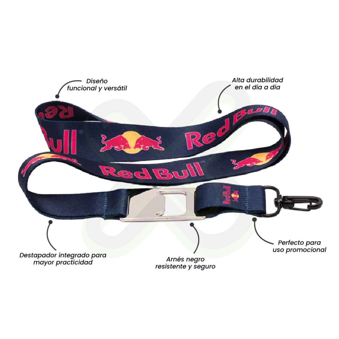 Haz que cada detalle cuente para tu marca. Con sublimación full color sobre cinta satinada y accesorios elegantes como el arnés negro y destapador, este lanyard resalta tu identidad corporativa en ferias, eventos y actividades internas.