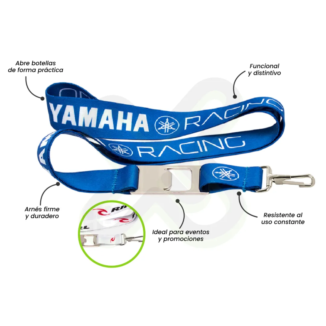 Material: cinta satinada; Medida: 2,5cm ancho; impresion: sublimacion full color; Accesorio adicional: Mosqueton rigido y destapador; Acabado: Paquetes de 50unds