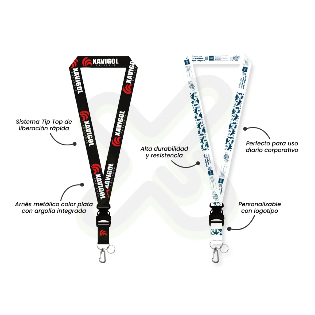 Haz que tu identidad corporativa destaque en cada detalle. Con sublimación full color, tip top plano de calidad y arnés plata, este lanyard proyecta profesionalismo y sofisticación, ideal para eventos, ferias y uso diario en tu empresa.