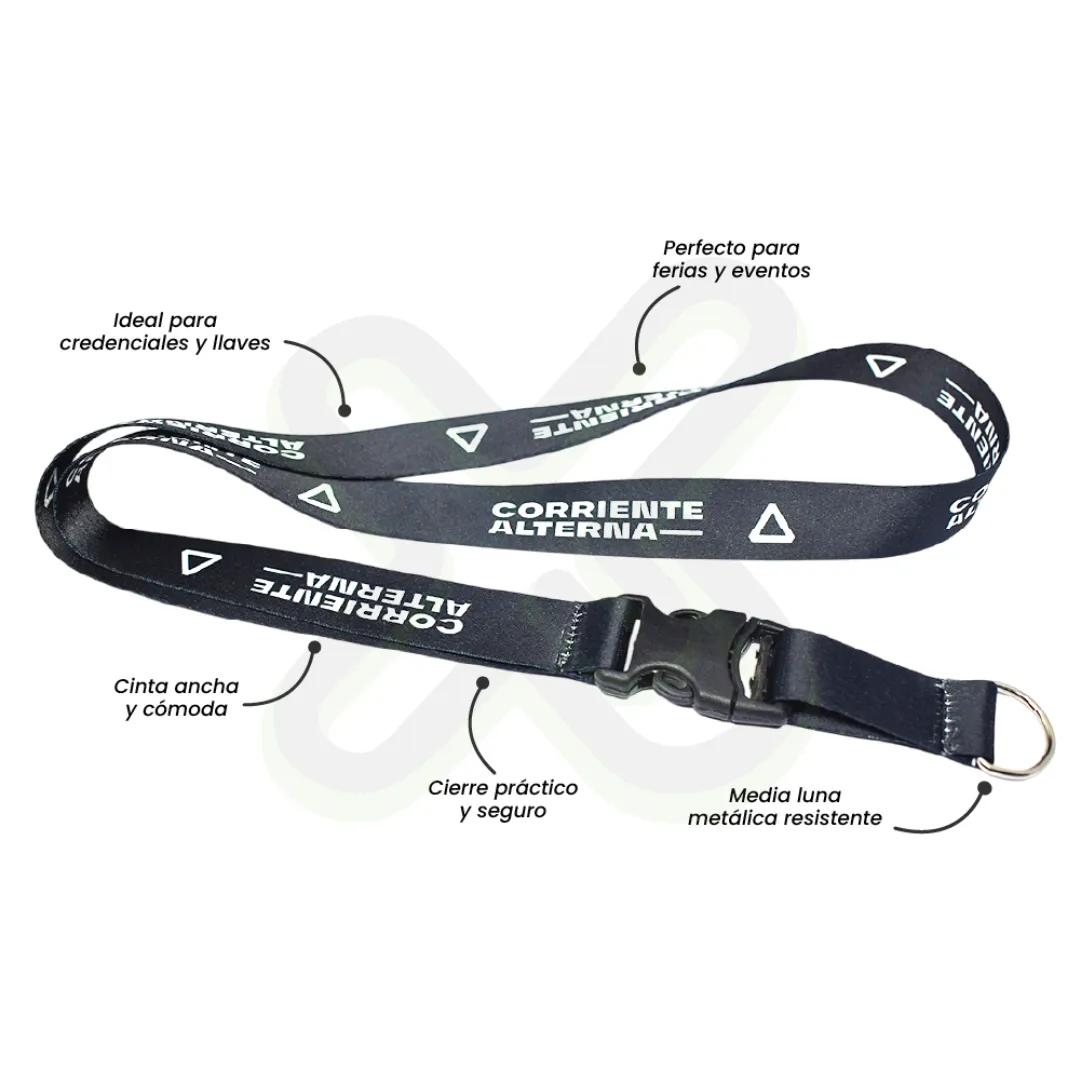 Lleva tus credenciales con total seguridad y estilo. Este lanyard de 2,5 cm combina tip top plano nacional y media luna, garantizando resistencia y facilidad de uso en el día a día corporativo.