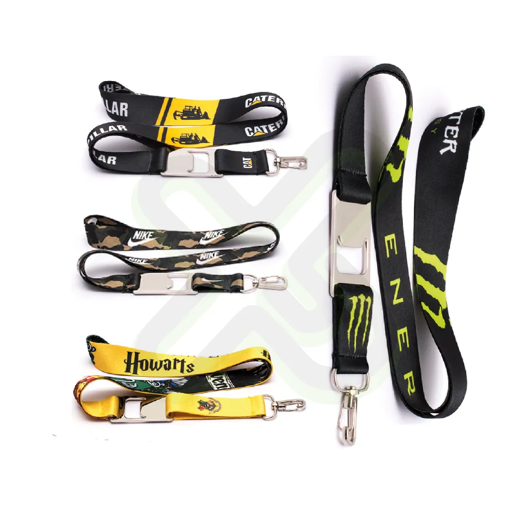 Material: cinta satinada; Medida: 2,5cm ancho; impresion: sublimacion full color; Accesorio adicional: Arnes plata y destapador; Acabado: Paquetes de 50unds