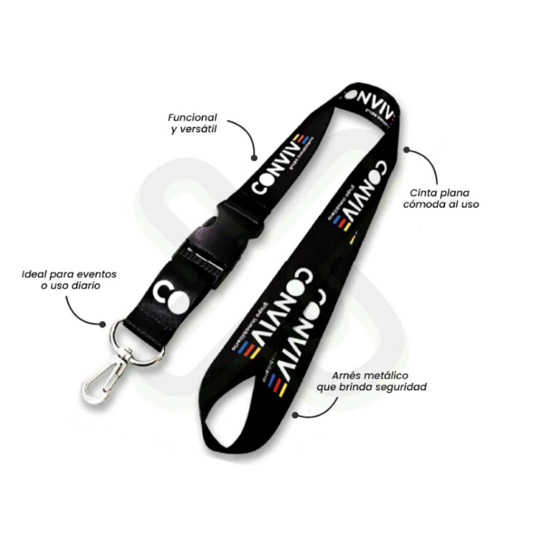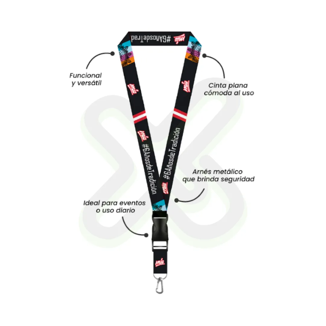 Cada detalle cuenta para dejar huella. Con impresión full color sobre cinta satinada y accesorios de alta calidad como tip top importado y arnés plata, este lanyard proyecta profesionalismo y fortalece la identidad de tu marca en ferias, eventos y oficinas.