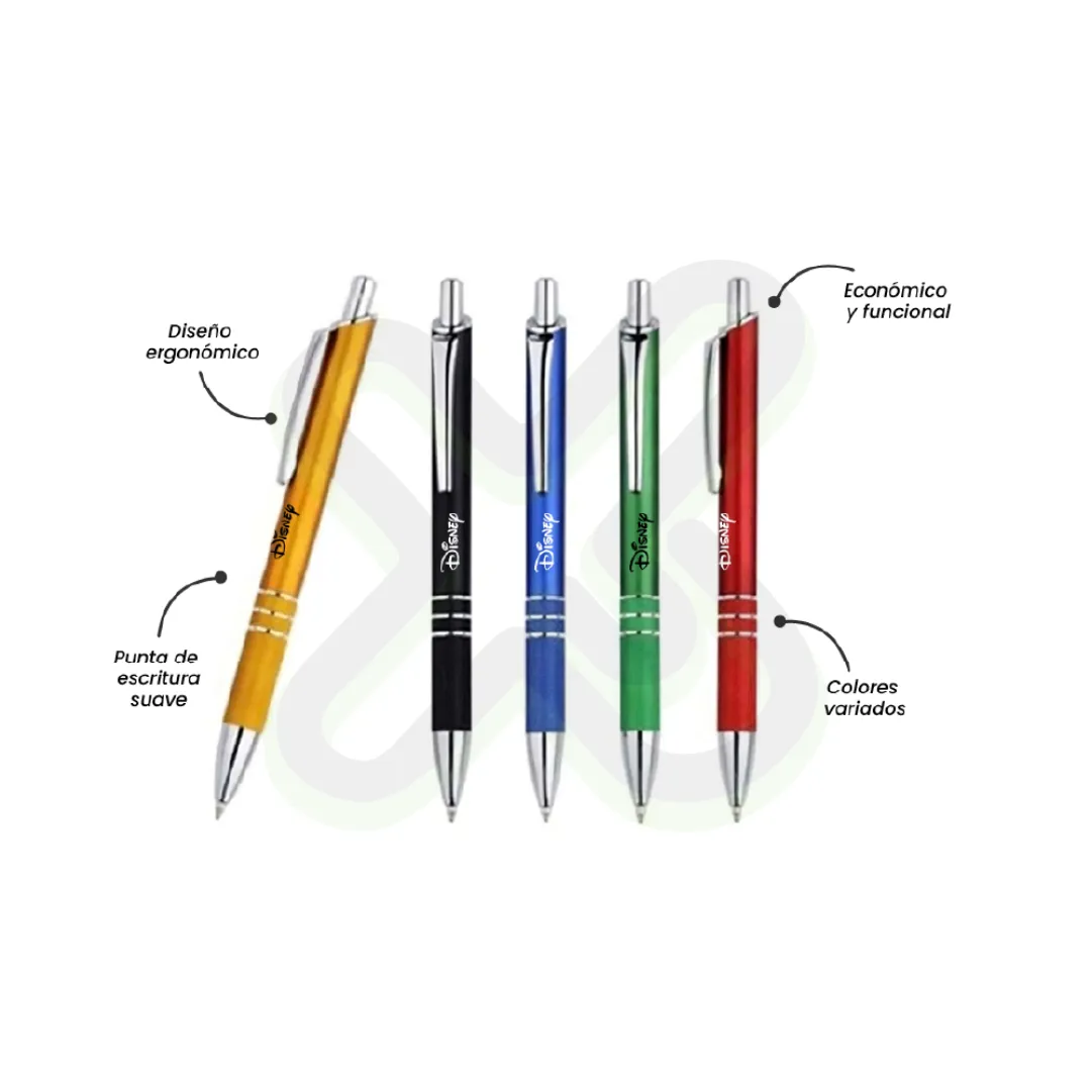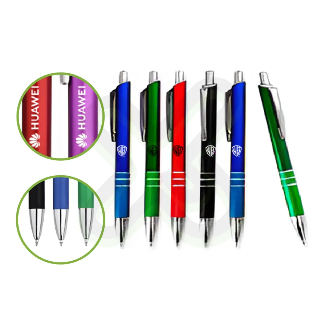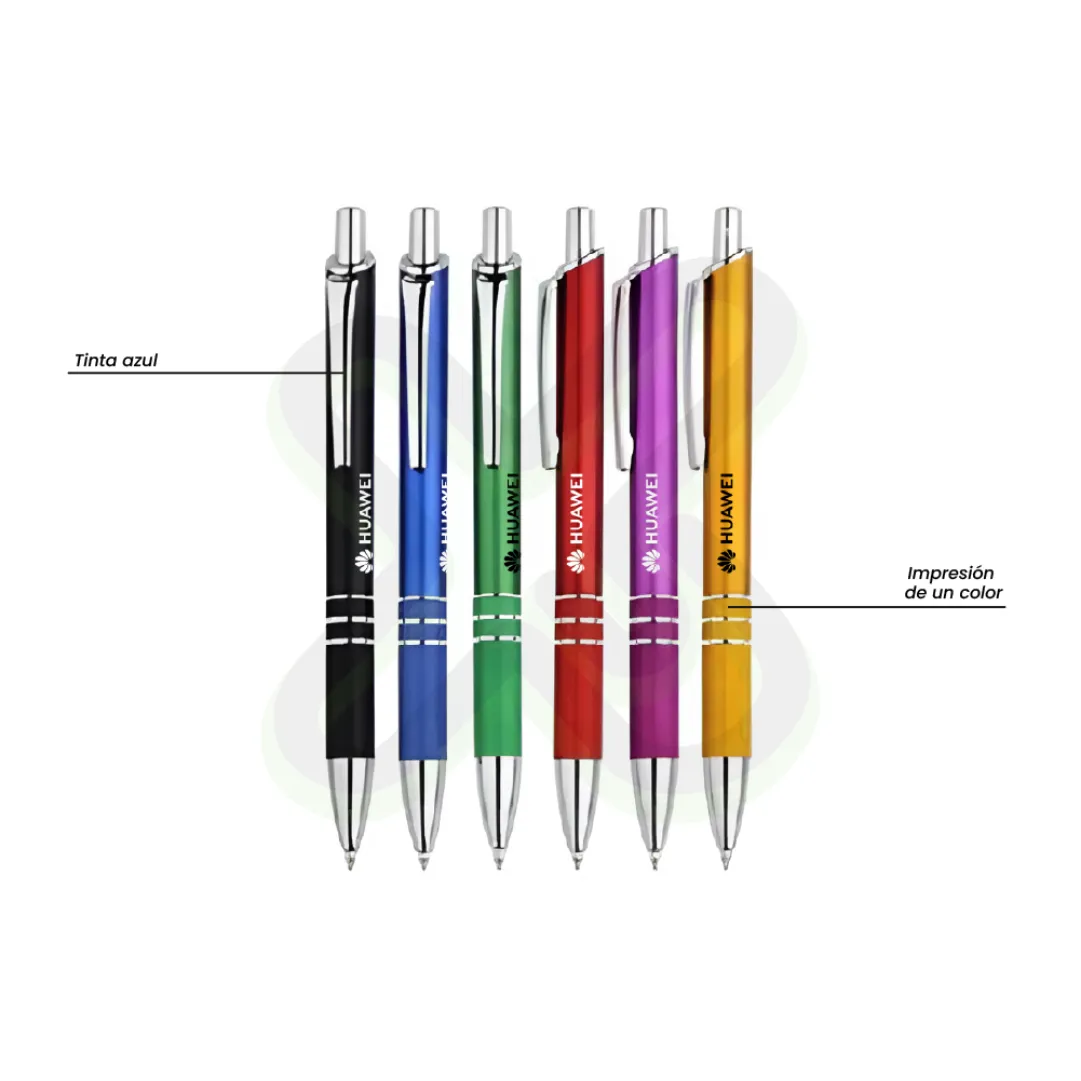 Lapicero metálico con tinta azul. Impresión en un color. Acabado: caja de 25 o 50 unidades. Elegante y práctico para branding masivo.