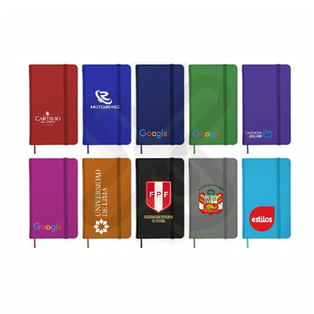 Material: Cubierta de poliuretano (apariencia cuerina), 80 hojas bond; Medida: 9*14cm aprox; impresion: uv full color; Acabado: caja de 25unds