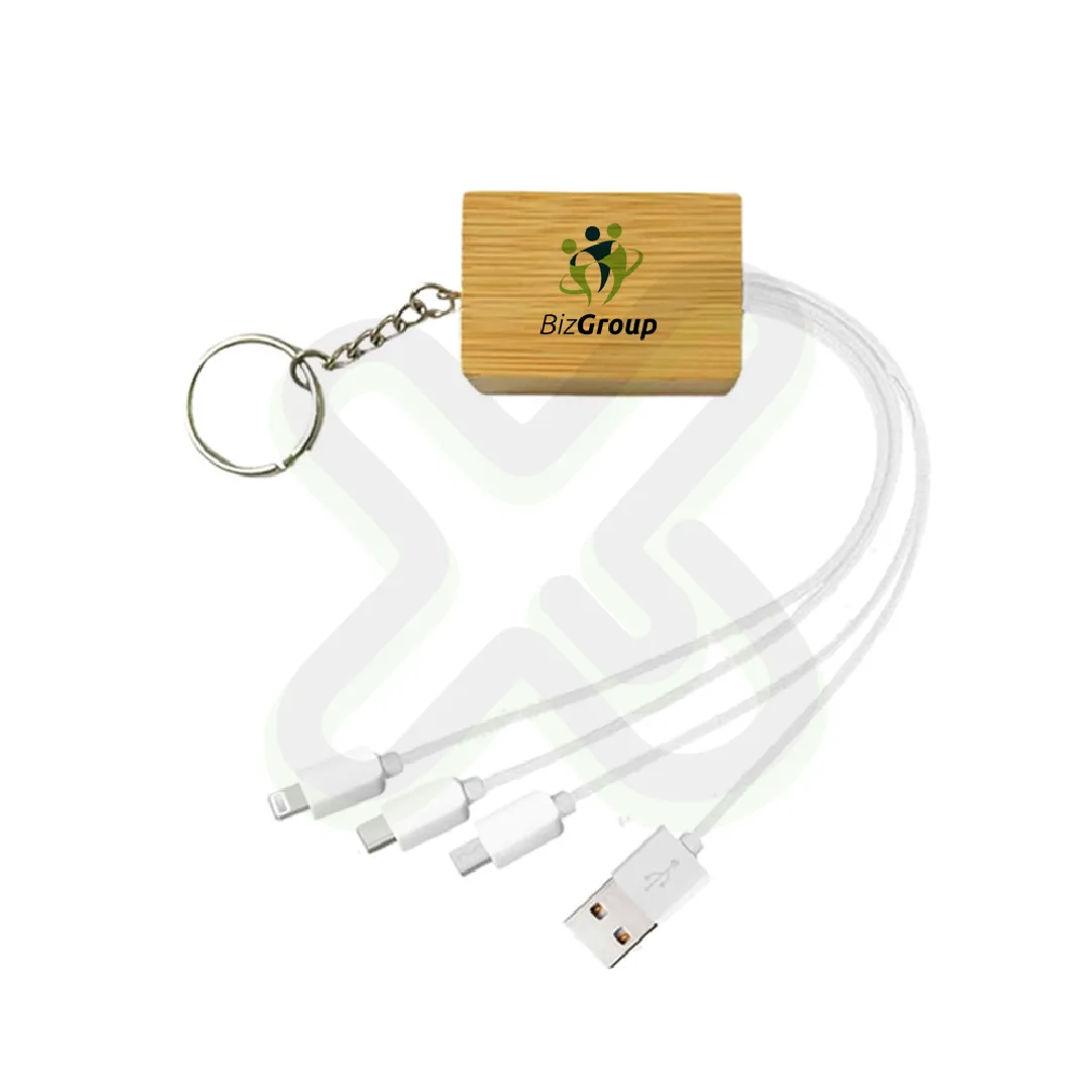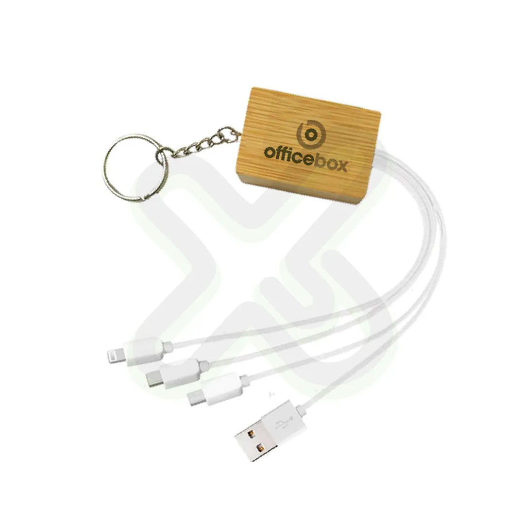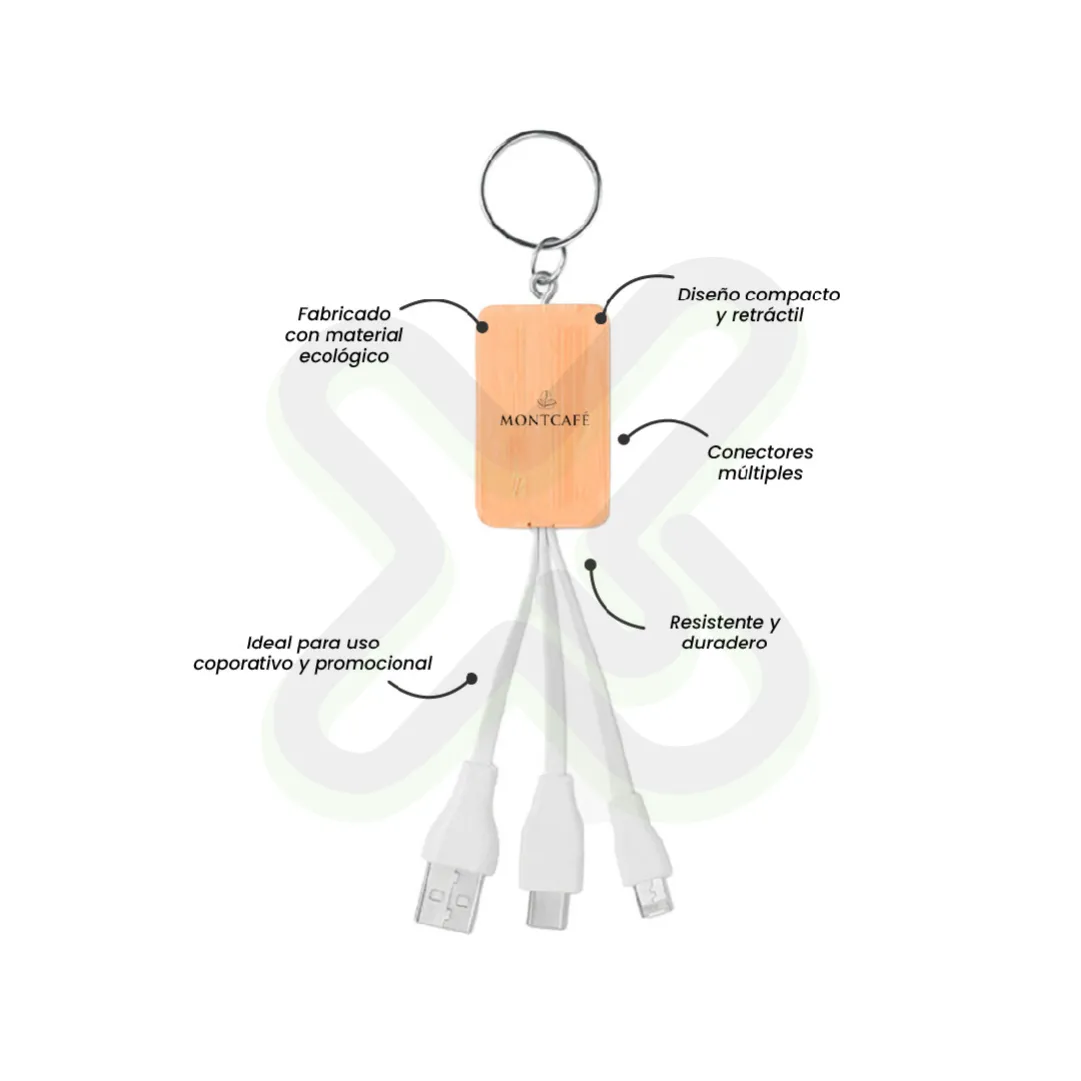 Llavero cargador de fibra de trigo. Medida: 22.5 cm aprox. Con cables de carga integrados. Impresión en serigrafía a un color. Acabado: caja individual.
