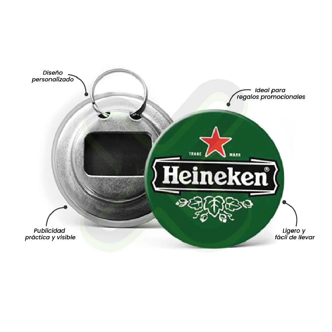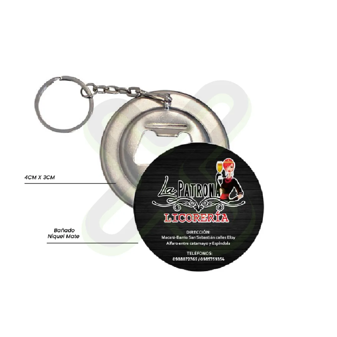 Llavero chapita galvanizado, 5 cm, con destapador. Presentación: paquete de 100 unidades. Ideal para merchandising y regalos corporativos.