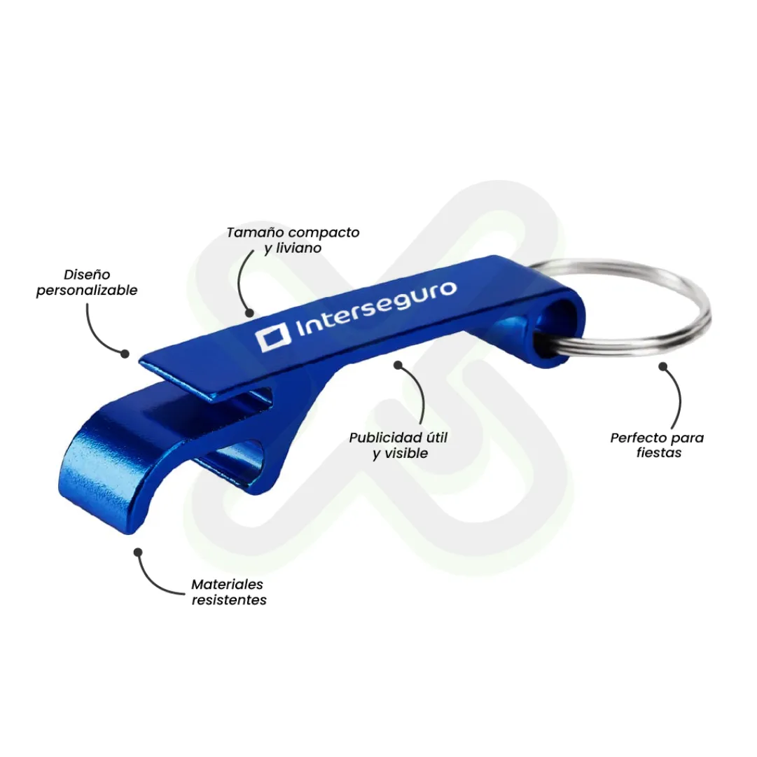 Resistente y compacto. Llavero metálico con destapador, ideal para eventos o campañas juveniles.
