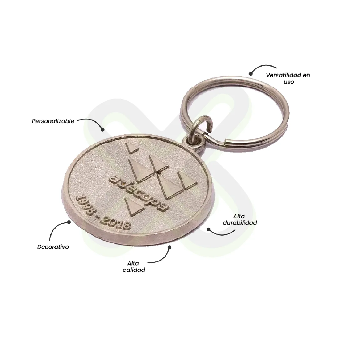 Llavero metálico en zamak de 4×3 cm, con argolla metálica y acabado en baño de níquel mate. Diseño compacto, sólido y resistente. Paquete de 100 unidades.