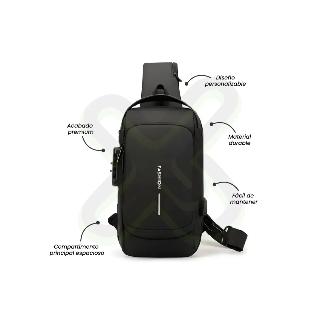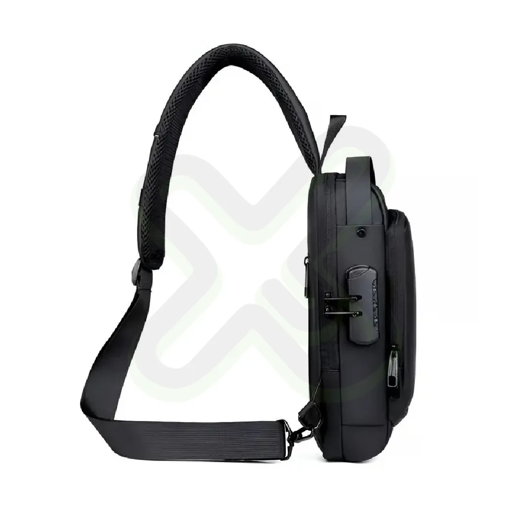 Seguridad y tecnología en un solo accesorio. Esta mochila cruzada incluye candado numérico de 3 dígitos y entrada USB doble para llevar tu cargador portátil.