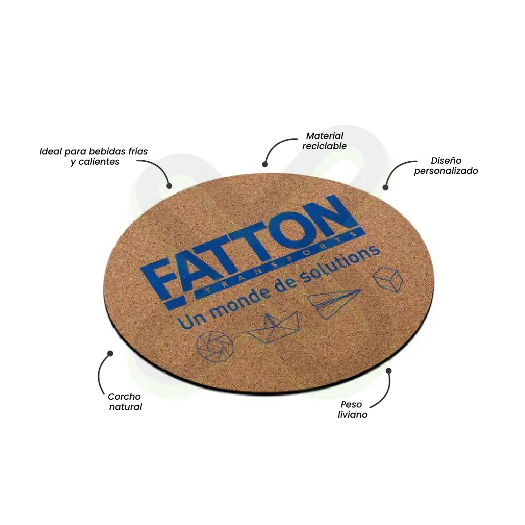 Material: Corcho; medida: 9cm de diametro; impresion serigrafia hasta 2 colores; acabado: empaquetado 10 unds