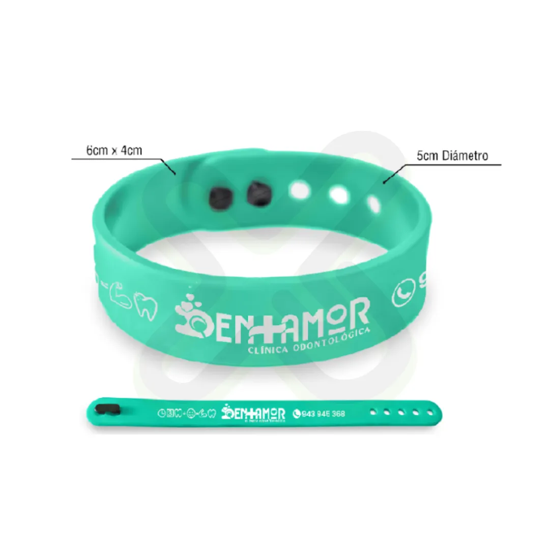 Pulsera de PVC termoformada con broche plástico. Medidas: 21 x 1.5 cm. Impresión a un color. Pack de 100 unidades. Ideal para uso diario y eventos corporativos.