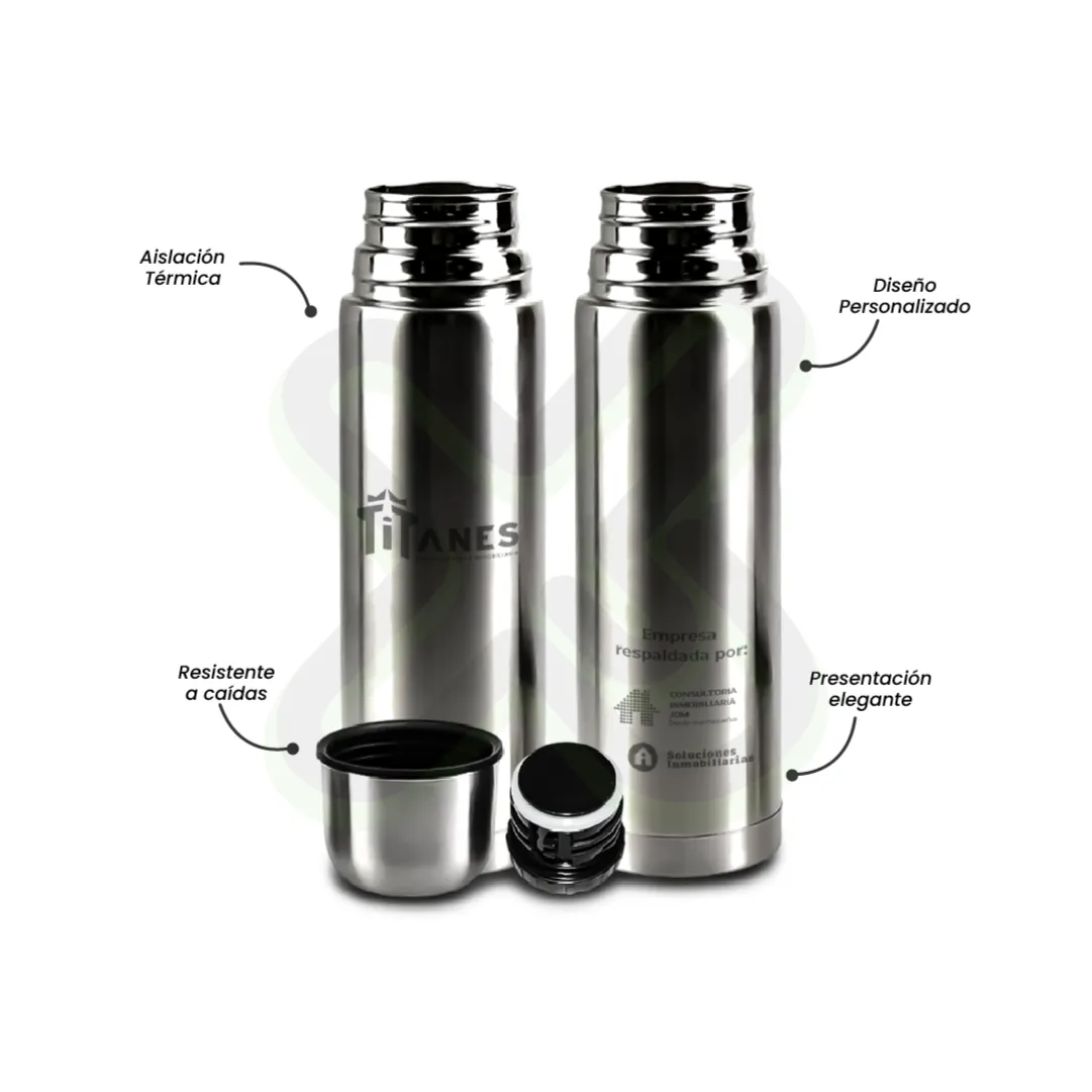 Thermo cafetera de acero inoxidable, capacidad 1 litro aprox., impresión full color UV DTF, entrega en caja individual blanca. Ideal para ejecutivos, eventos y fidelización.