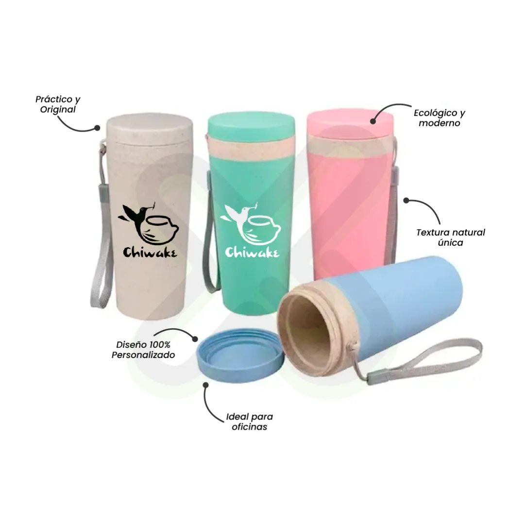 MATERIAL: Fibra de trigo MEDIDAS: Altura 16.2cm Ancho: 6cm CAPACIDAD: 250 ml ACCESORIO: pita para llevar IMPRESION: serigrafia ACABADO: