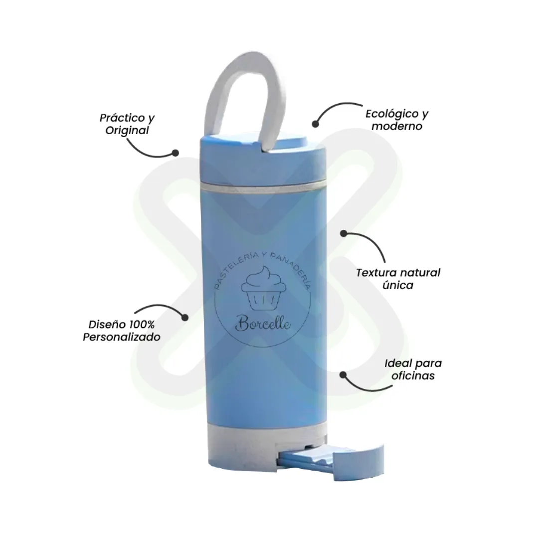 MATERIAL: Fibra de trigo MEDIDAS: 18.5 x 6.5 cm CAPACIDAD: 350 ml ACCESORIO: Pita para llevar IMPRESION: serigrafia ACABADO: