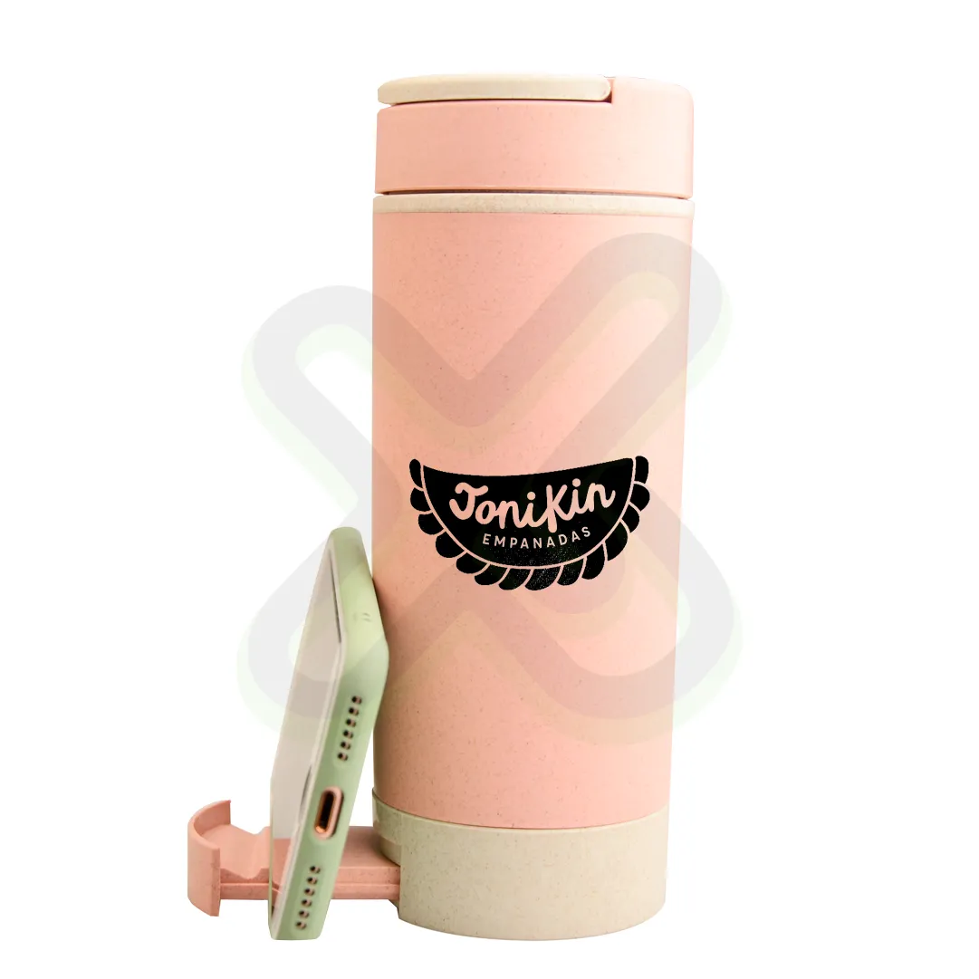 Tu bebida y tu celular, siempre a la mano, con estilo consciente. Con impresión serigráfica sobre fibra de trigo, este tomatodo cafetera de 350 ml con soporte para teléfono es ideal para regalos corporativos o merchandising, destacando tu marca en cada detalle.